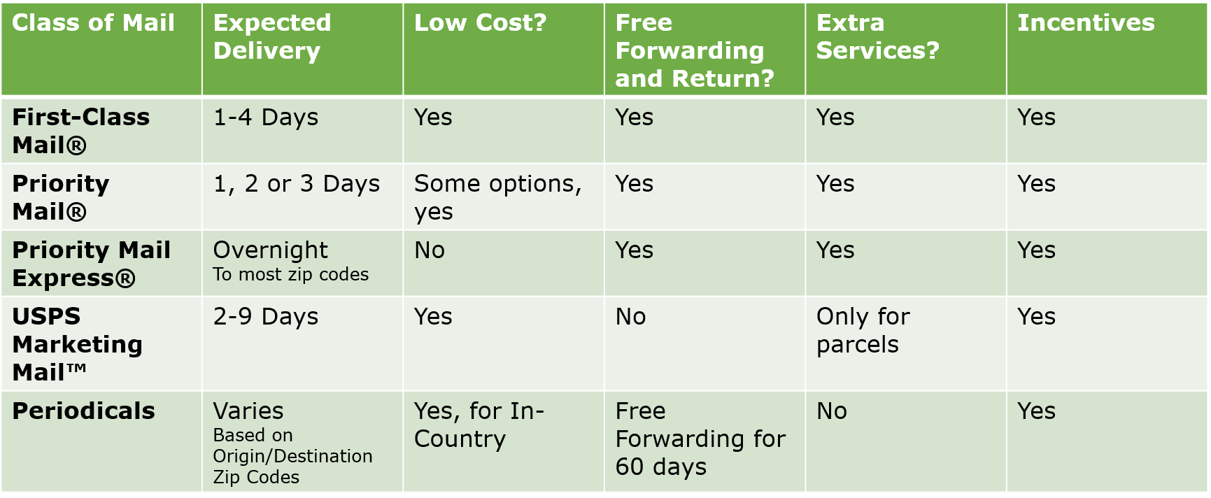 The USPS® assigns mail into different services, called “classes.” Each class of mail has its own features, service levels, postage prices and presort requirements. Here’s the breakdown of all the different mail classes: